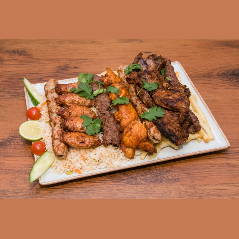 2 Lamb Kebab, 2 Chicken Kebab, 4 Lamb Chops, 4 Charcoal Wings, 4 Charcoal Chicken Tikka Served With Rice And Fries.